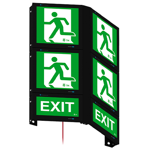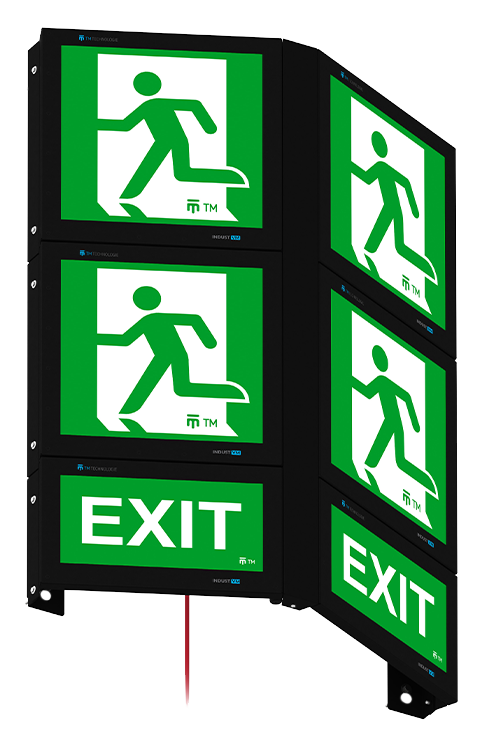 Las luminarias Indust VM han sido diseñadas para funcionar en condiciones difíciles. Su alta resistencia a la penetración de polvo y agua garantiza un funcionamiento fiable. Su estructura reforzada y su carcasa con clases de protección IP66, IP69 e IK08 garantizan su durabilidad y resistencia a los daños mecánicos. La forma bilateral de la luminaria garantiza la visibilidad de las señales de evacuación desde una distancia de hasta 60 metros. La luminaria indica con precisión un ángulo de 140° entre las señales, lo que aumenta la legibilidad y la seguridad de la evacuación.