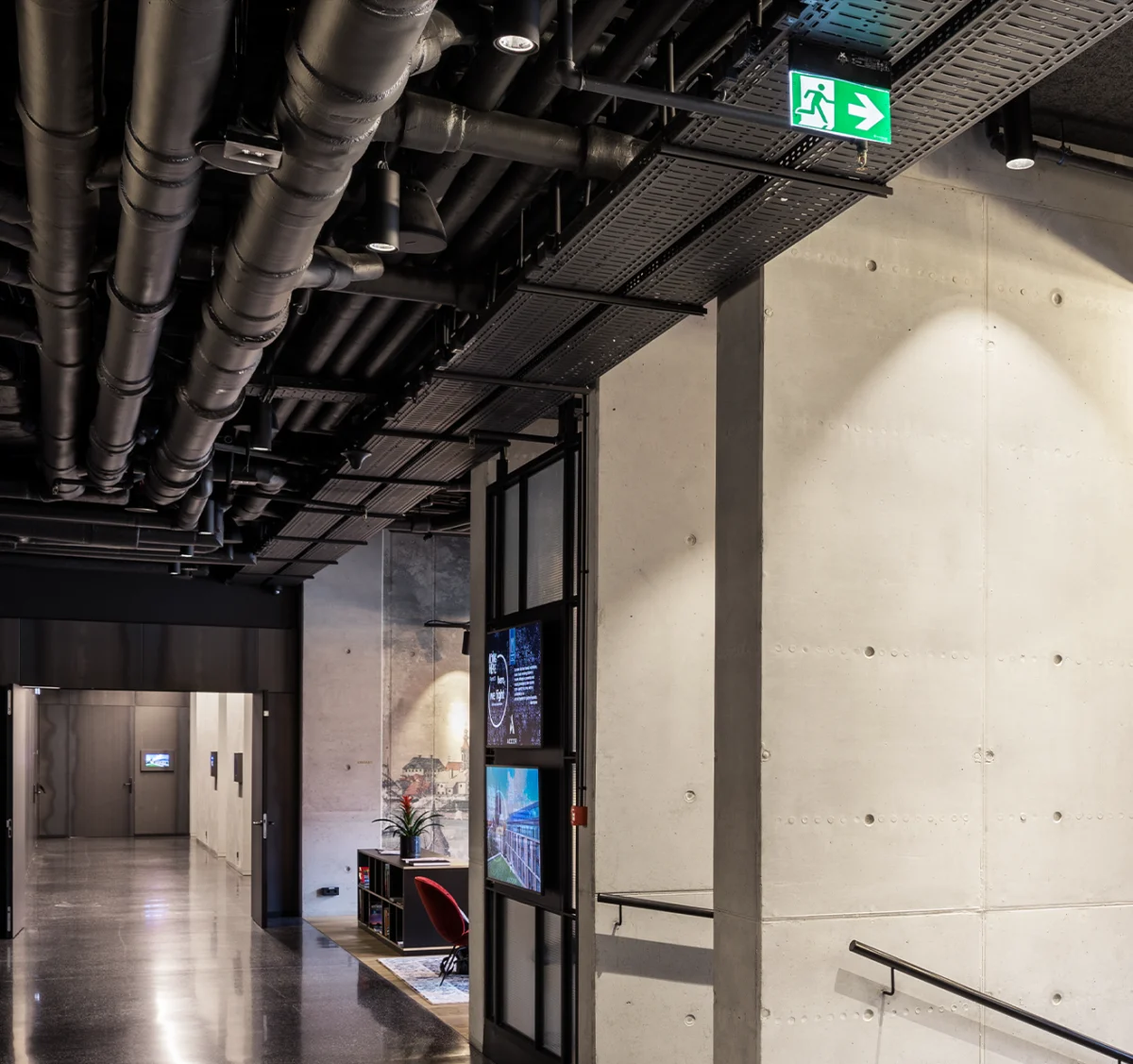 W stylu industrialnym oświetlenie ewakuacyjne podkreśla zupełnie inny sposób myślenia o przestrzeni.